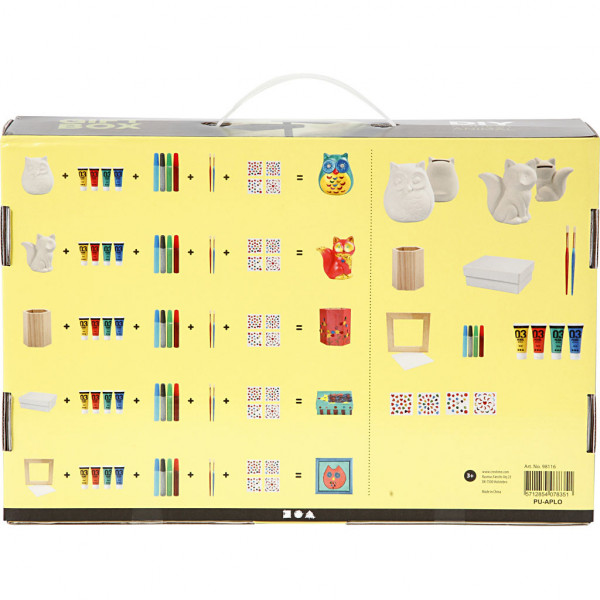 Contents: 2 terracotta animals, one canvas in wooden frame, 1 pencil holder of wood, one cardboard box, 2 brushes, 4 tubes of paint and 4 x glitter paste in the assorted colours. 4 sheets with adhesive rhinestones in different shapes and colours.