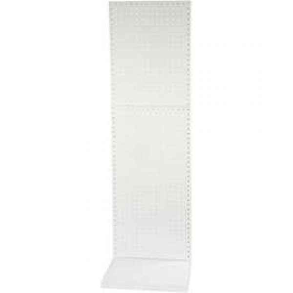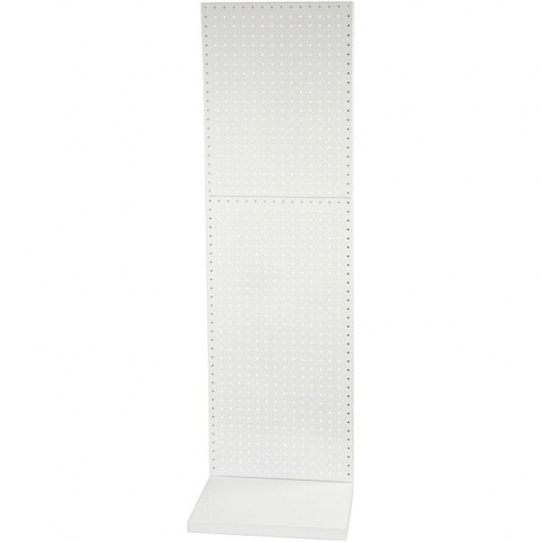 Robust and flexible display system in white painted metal with perforated plates, L-base and base shelf.