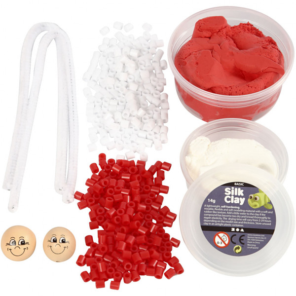 Contents: 40 white and 40 red beads, 40g Red Silk Clay, 14g Silk Clay, 2 wooden faces and 2 white pipe cleaners.