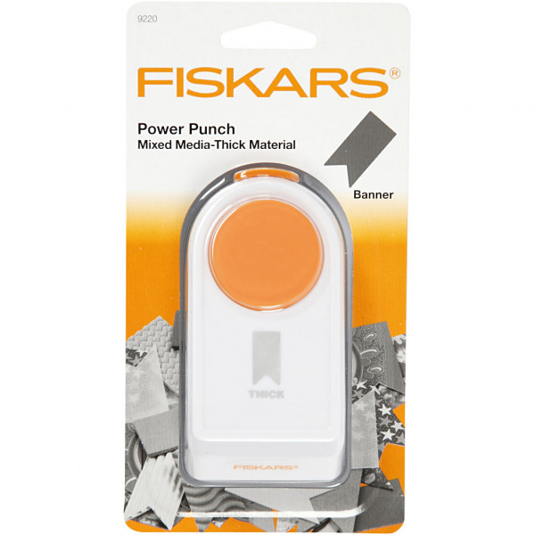Heavy punch from Fiskars. Punches wood veneer (max 1 mm), cork (max 1 mm), artificial leather (max 0.9 mm), corrugated cardboard (max. 1.38 mm), cardboard (max. 2.4 mm) and EVA Foam (max 1.5 mm).