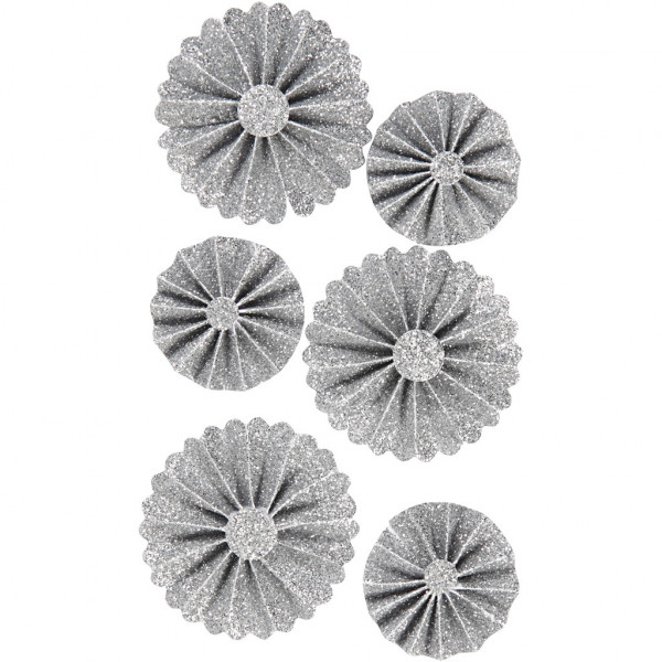 Paper Rosettes, D: 35+50 mm, 6 pcs, silver glitter [HOB-24786]
