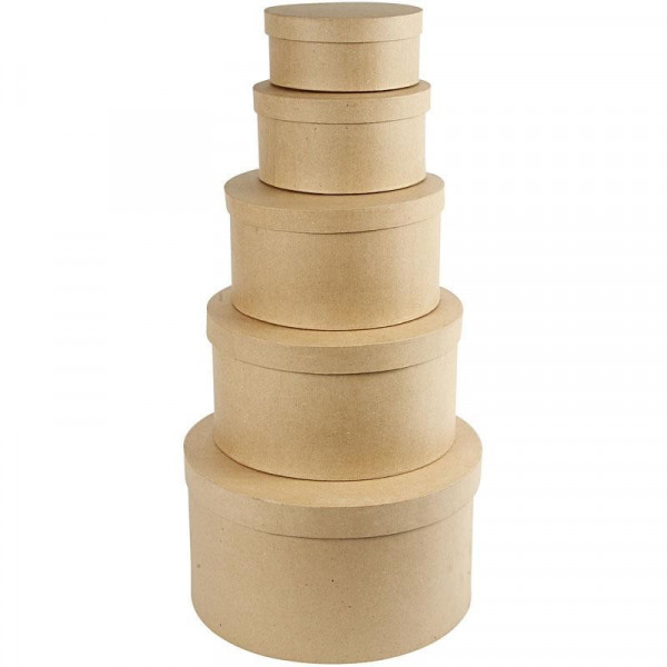 Round, hand-made hat boxes of papier-mâché with lids. Set of 5 sizes.